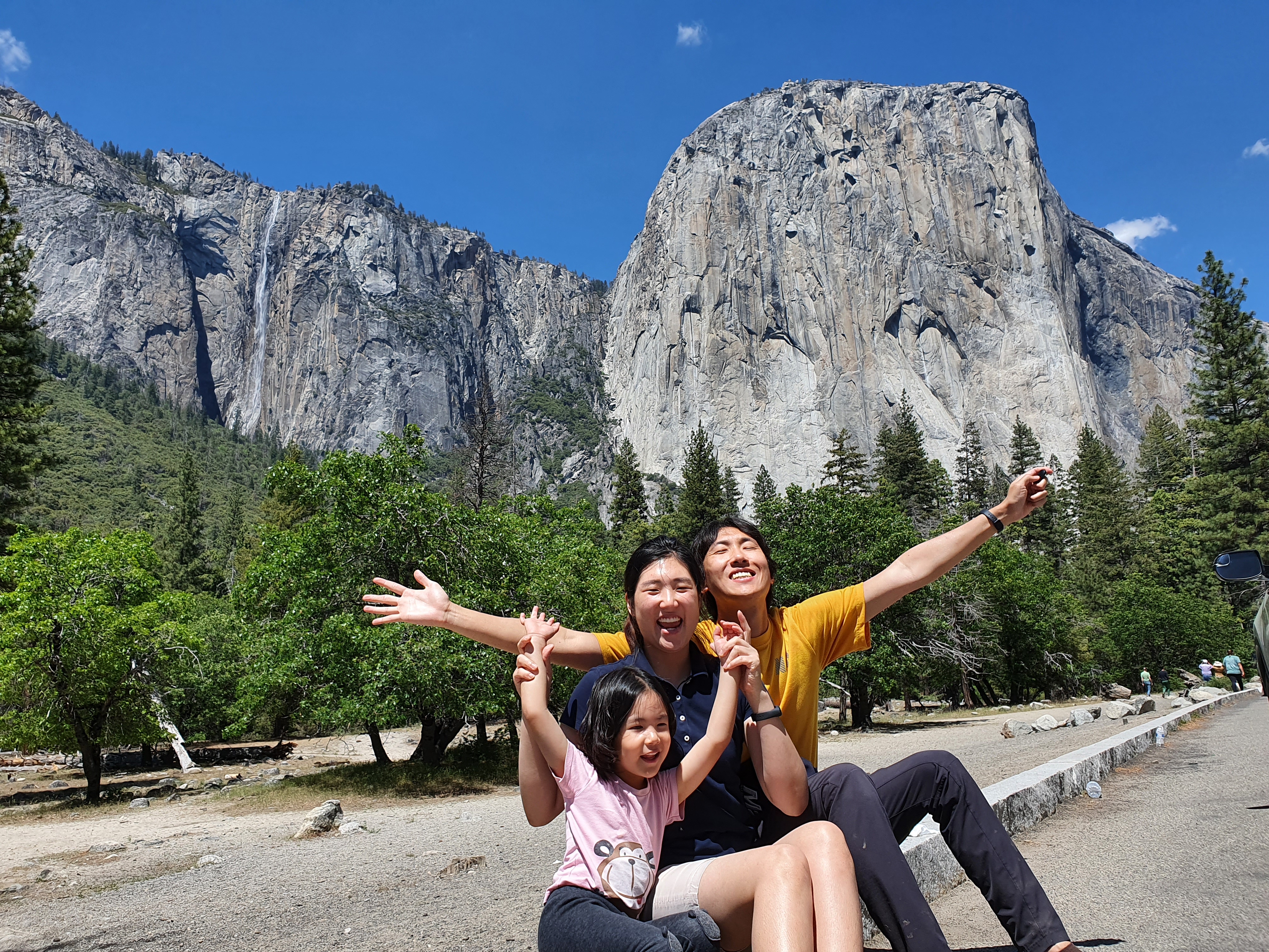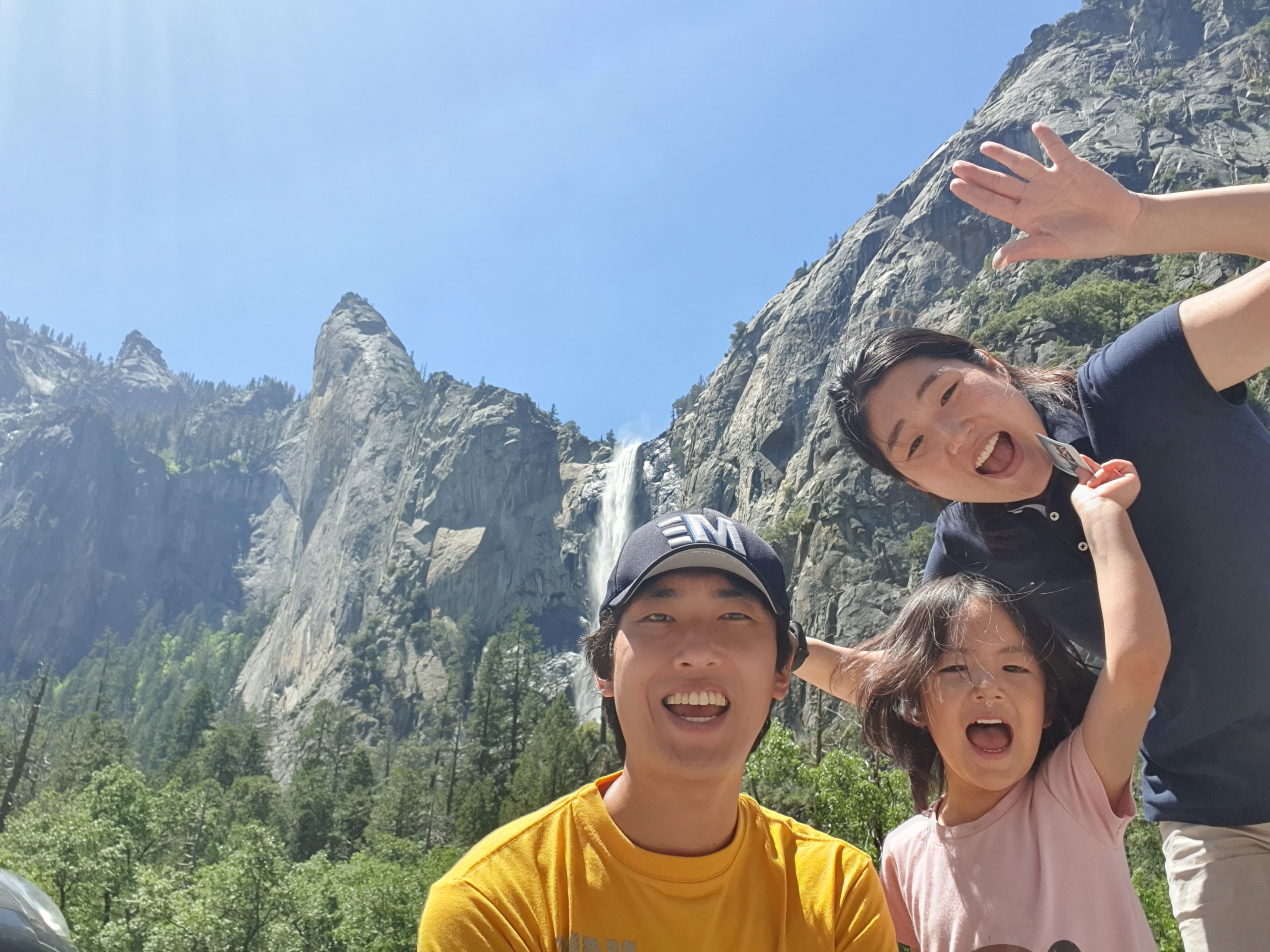Bridalveil Falls가 보이는 가족 셀카(당시는 공사중이라서 트레일은 못갔다.) <<요세미티 밸리(Yosemite Valley) 내의 Vernal Falls 가는 길(Mist Trail & John Muir Trailhead)>>