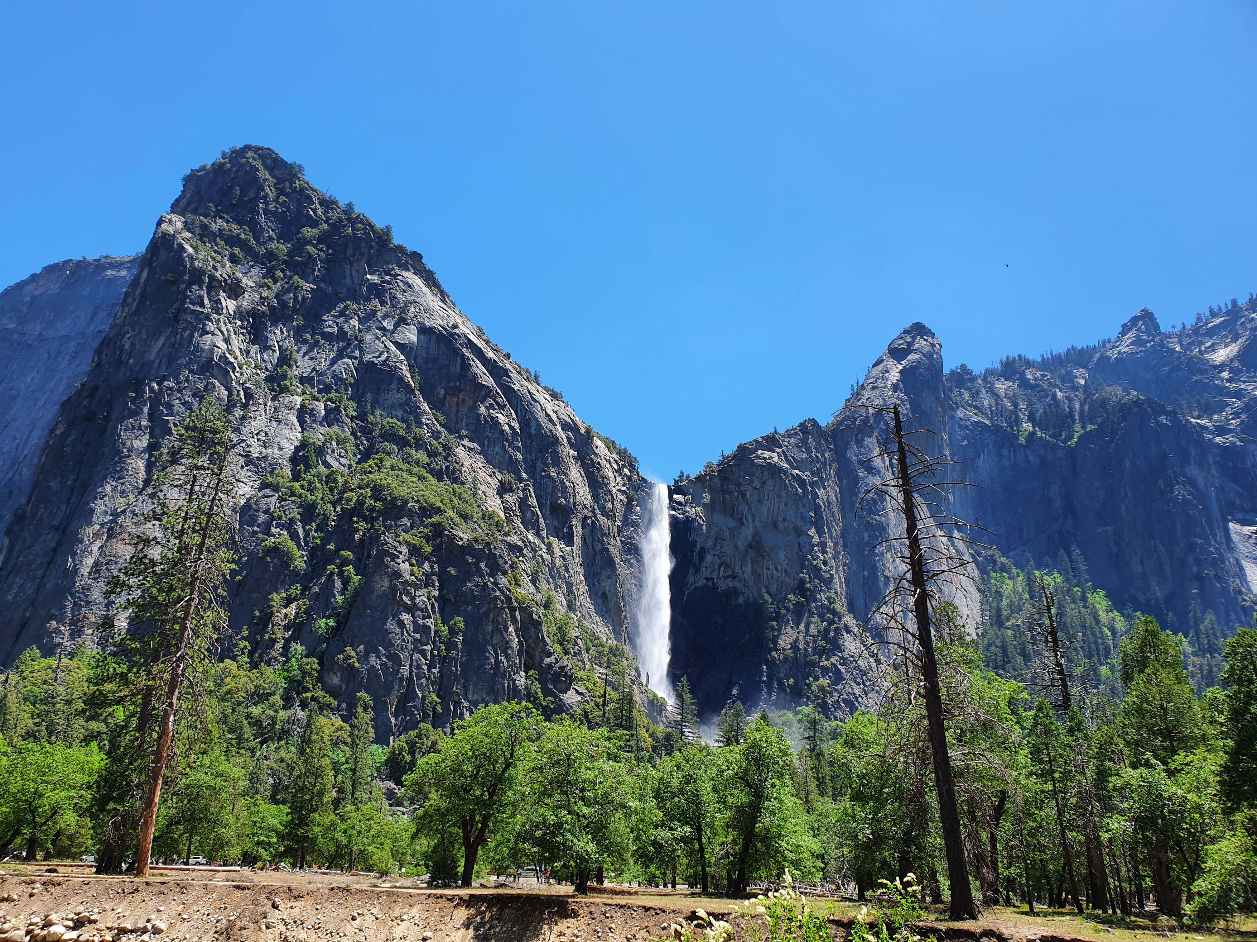 요세미티 밸리를 나오는 길에 앞에 공사로 차가 멈춘 바람에 내려서 막 찍은 뷰다. 진짜 이거 퍼온거 아니라 갤럭시S10으로 직찍한 거라는게 지금 봐도 신기하다. 보이는 폭포는 브라이덜베일 폭포이다. <<요세미티 밸리(Yosemite Valley) 가 보이는 워시번 포인트(Washburn Point)>>